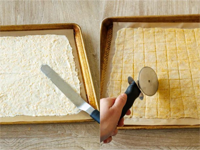 Spread – spread your batter over your parchment-lined baking sheet (an offset spatula makes it easy to spread into an even, very thin layer that is almost transparent (my rectangle measured 14×11 inches).Season – Lightly sprinkle the top with flaky salt (don’t use too much or the crackers will be too salty).Bake and Score – Bake for 10 minutes, then remove from the oven and score with a pizza cutter into 1-inch squares. Optional: use the back of a skewer to poke a hole in the center of each cracker.