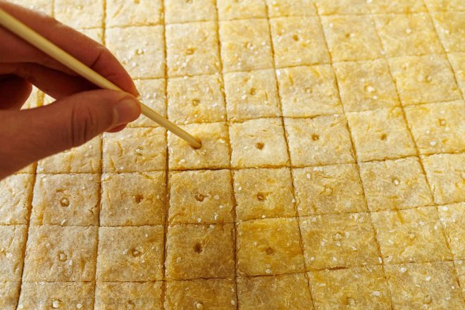 Fun Fact: The holes poked in store-bought crackers actually serve an important purpose. “Docking” doughs that are higher in fat, such as pie crusts, cheese crackers, and thin cookies, provide a vent to release steam. This prevents the baked goods from puffing up and cracking during baking.