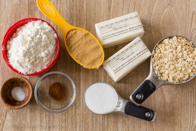 Apple Crisp Topping IngredientsWe like to make apple crisp recipes with oats as the topping since they are both soft and chewy. Here’s the winning apple crisp topping mixture.