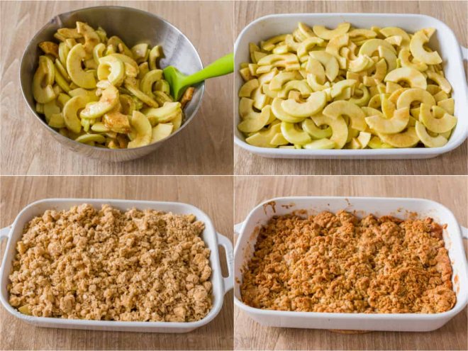 Prep – Butter a 9×13 casserole dish, preheat oven to 375˚F.Cut Apples – peel, core, and slice apples into 1/4″- thick pieces (an apple peeler makes it easy), then transfer to a bowl, and toss with 2 Tbsp lemon juice. Coat Apples – in a bowl, combine flour, sugar, and cinnamon then sprinkle over apples and stir to coat. Transfer to buttered casserole dish.Topping – In a mixing bowl, combine flour, oats, both sugars, cinnamon, and salt. Add diced softened butter and use your hands to stir in the butter until pea-sized crumbs form throughout. Then, spread the topping evenly over your apples.Bake – place on the center rack in the oven and bake uncovered for 45-50 minutes until bubbling at the edges. If the top is browning too quickly, loosely cover the dish with aluminum foil until the apples are bubbling.