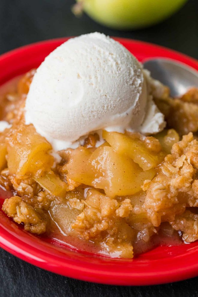The best way to serve apple crisp is warm, topped with a generous scoop of vanilla bean ice cream. You can try topping it with caramel sauce, greek yogurt, or whipped cream as well.