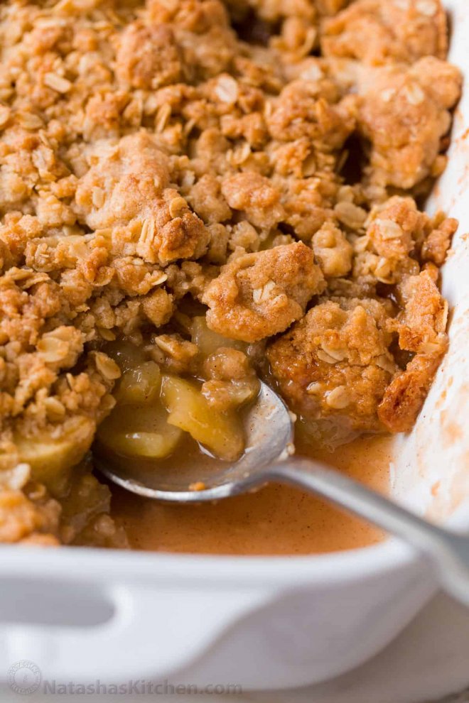 Nuts – add chopped nuts or sliced almonds to your streusel toppingCaramel Sauce drizzled over the top just before servingCranberries – add 1 cup fresh or 1/2 cup dried cranberries and add more sugar if using fresh cranberries. You’ll love the Cranberry Apple Almond Crisp in Natasha’s Kitchen Cookbook!Spices – add a pinch of cloves, nutmeg, or even candied ginger Which Apples are Best for Apple Crisp?Select firm apples so they won’t get mushy in the oven. Apples vary a ton in sweetness so adjust sugar accordingly. We used Golden Delicious here with 3/4 cup of sugar, but if you use Granny Smith Apples, increase the sugar to 1 cup or add it to taste.