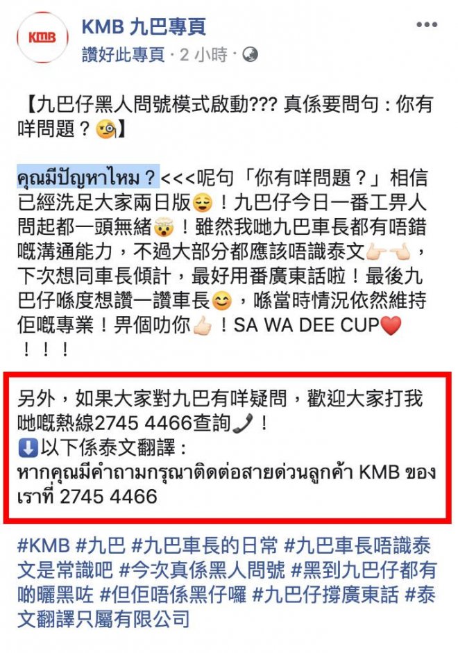 九巴除了回應影片、表揚車長反應及教乘客泰文外,亦建議乘客有任何問題,可以致電到他們熱線,同時更搞笑地附上泰文版熱線資料。