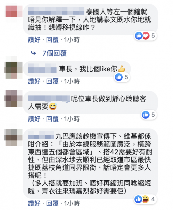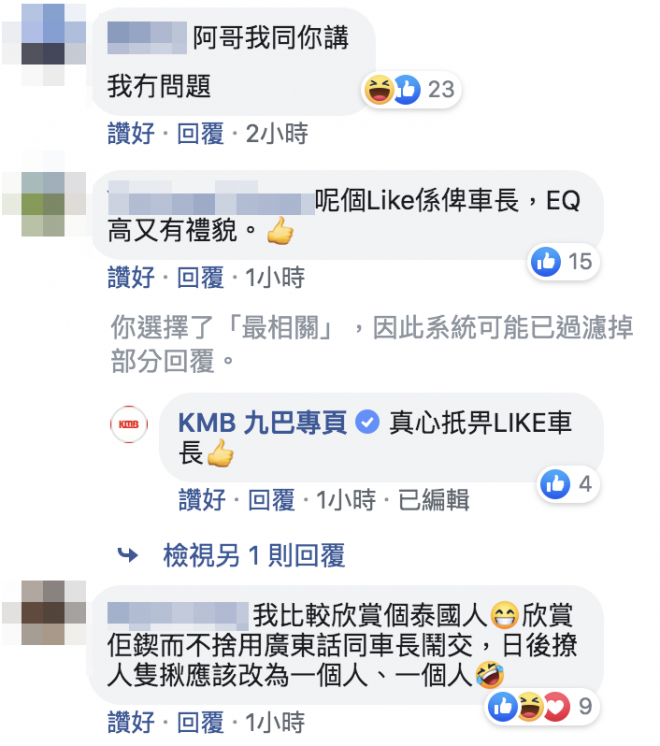 廣東話版及泰文版的九巴熱線網民搞笑回應有不少網民在九巴貼文下面,重溫泰國乘客的金句,更有網民大讚車長EQ高且有禮貌。