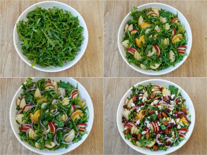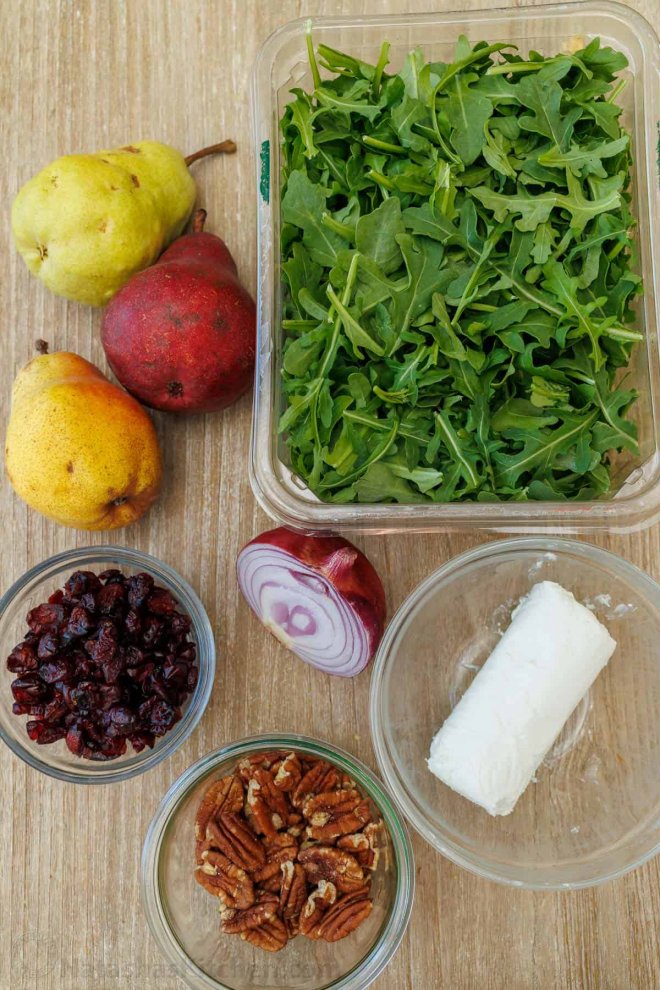 Assemble the Salad – In a large shallow salad serving bowl, add your arugula greens. Top with pears and onions.Add Toppings – Sprinkle on goat cheese, cranberries, and nuts.Dress the Salad – Shake your dressing again if it has separated and drizzle it over the salad just before serving. You can serve it with or without tossing; it’s prettier if you don’t toss it. Don’t worry—the dressing will work its way down to the greens!