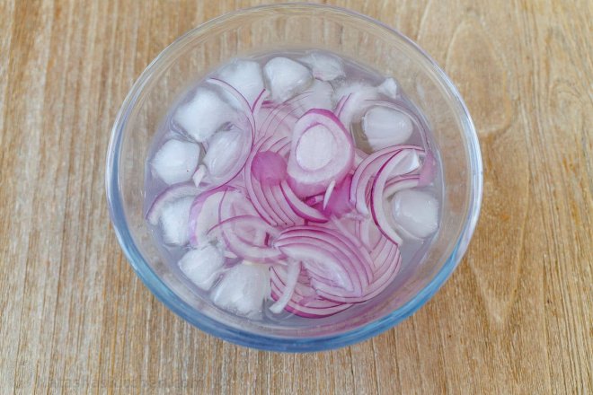 Bartlett Pears: Known for their juicy sweetness and soft texture. Bartlett pears turn yellow as they ripen.Bosc Pears: Their firm, crisp texture, and slightly spicy flavor provide a satisfying crunch. Bosc pears are golden-brown or tan.Anjou Pears have a sweet and smooth texture and are a light green color.Comice Pears: Have a buttery sweetness and juicy flesh. Comice pears are green with a hint of red or yellow.Red Pears: Adding a pop of seasonal color, red pears offer a sweet and mild flavor. Red pears range from deep red to dark burgundy in color.How to Make Pear SaladPrepare the Onions (Optional) – Soak the onions in a small bowl of iced water for 10 minutes to remove some of their harsh flavor. Drain well and pat dry with a paper towel.