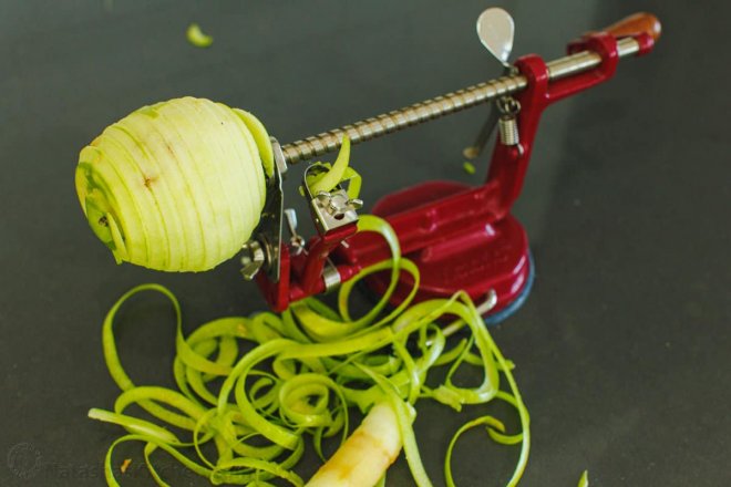 It’s pretty neat and definitely makes processing even a large number of apples a breeze, but if you don’t have a tool like this, the next best option is a vegetable peeler or paring knife.