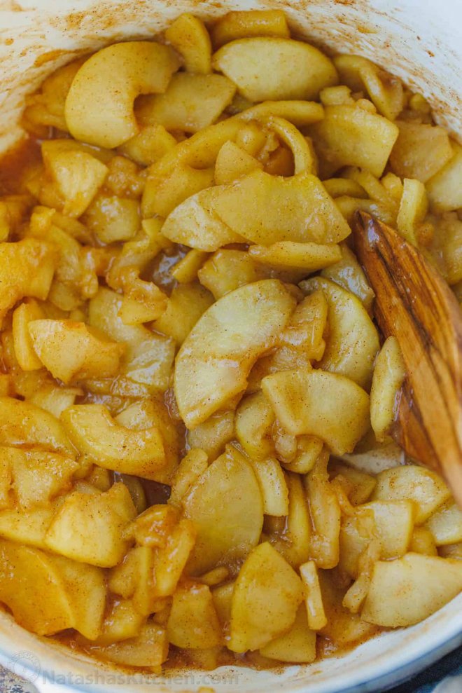 As a Topping – Over Steel Cut Oats, yogurt, overnight oats, Sourdough Pancakes, or Waffles.As a Dessert – Served in a bowl a la mode topped with a scoop of ice cream, or over a slice of Sharlotka Apple Cake.Pie filling – fill a pie crust with sauteed apples for the best apple pie or even Dutch apple pie. You can also fill puff pastry to make Apple Turnovers. Crepe filling – fold the cinnamon apples into warm crepes and dust with powdered sugar or drizzle with caramel sauce. With Pork – Apples and pork are a great match. Try this over sliced Roasted Pork Tenderloin or Grilled Pork Chops.