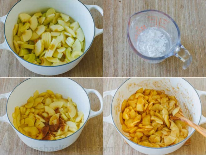 Melt Butter in a Dutch oven or deep sauté pan on the stovetop (or use a skillet with a lid).Add the Apples and stir to coat. Cook with the lid on for 6-8 minutes to soften them up, stirring occasionally.Make a Slurry – Whisk together cornstarch and water, then add the slurry to the apples. Stir in honey and cinnamon.Cook – Simmer to thicken for 2-3 minutes more, until the apples are fork-tender.