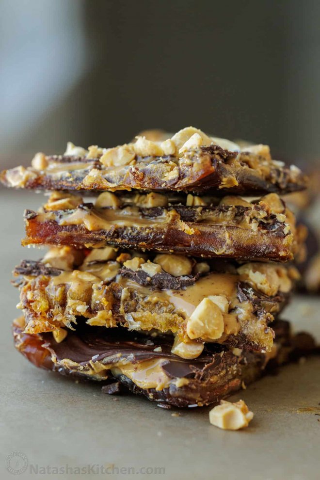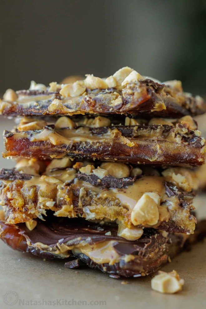 Soft Dates – mejool dates are ideal because they have a soft and moist texture and will be easier to roll out. Avoid dates that are dry or shriveled. These are the same dates we used to make Bacon Stuffed Dates.Add peanuts to melted chocolate to ensure it sticks nicely, and then press the peanuts down gently with your fingertips to help them adhere. Don’t overheat chocolate – heat the chocolate chips in 30-second increments and stir between increments. As soon as all of the chocolate blends together and melts when stirred, it’s ready. Overheating will make the chocolate dry. Freeze to set – set the date bark in the freezer for 30 minutes to set, and it will be much easier to slice without the peanut butter oozing out.