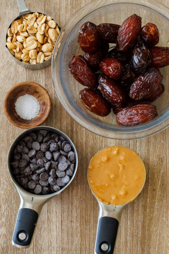 Medjool Dates – pitted, offer natural sweetness and a chewy texture that replaces caramel. They also help bind all the ingredients together.Chocolate Chips – Use semisweet or milk chocolate. They add sweet indulgence to this recipe.Natural Creamy Peanut Butter – Stirred, it provides a smooth, creamy texture, nutty flavor, and helps to bind the ingredients together.Peanuts – Add crunch and texture to the recipe while complementing the sweetness of the dates and chocolate.Kosher Salt – Sprinkled on top (optional)