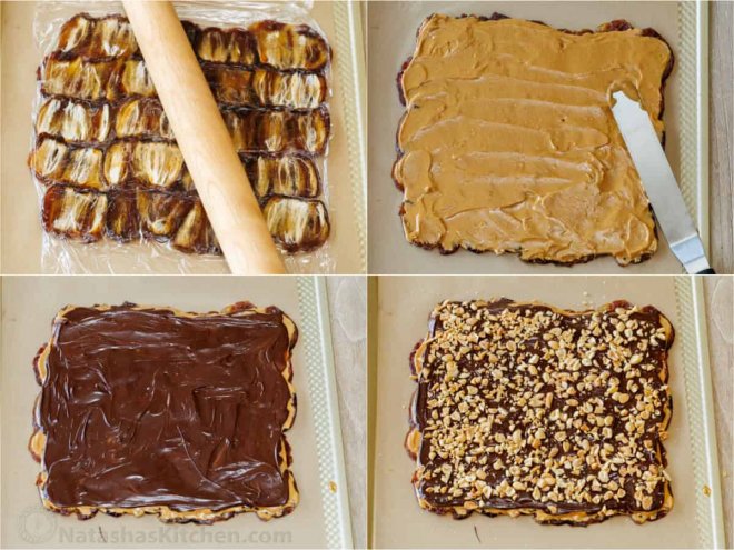 Roll the Dates – Line a baking sheet with parchment paper. Pit the dates and open them so the sticky centers are facing up. Arrange the dates side by side on the parchment paper to form a rough rectangle shape. Cover with a second sheet of parchment paper and use a rolling pin or cup to press the dates into an even layer, ensuring all spaces are filled.Spread Peanut Butter – Remove the top layer of parchment paper and spread the peanut butter evenly over the dates. An offset spatula helps achieve an even layer.Melt the Chocolate – In a microwave-safe bowl, heat the chocolate according to the package instructions until melted. Stir the chocolate every 30 seconds; it usually takes 60 to 90 seconds to fully melt.Drizzle the melted chocolate over the peanut butter, then use a spoon or offset spatula to spread it into an even layer over the peanut butter.Finish with Nuts – While the chocolate is still soft, sprinkle the chopped peanuts (or nuts of your choosing) on top and gently press them into the chocolate. If using, sprinkle on the kosher salt.