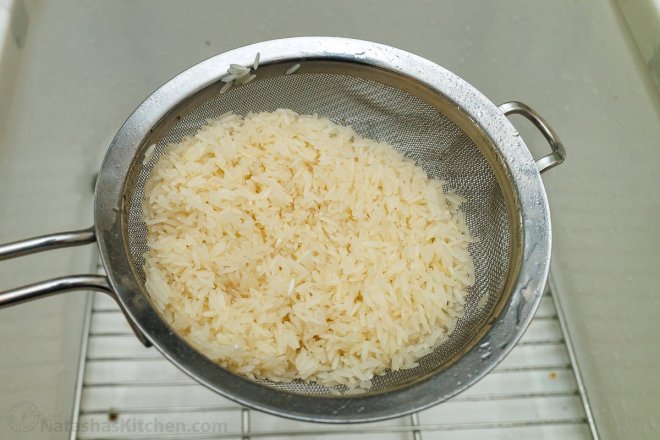 How To Rice Rice: Put rice in a fine mesh strainer and rinse the rice under cool water until the water runs clear underneath. Drain it thoroughly before proceeding with the first step of the Cilantro Lime Rice recipe.