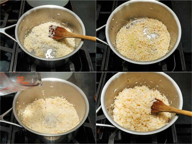 Pro Tip:It’s ok to add the rice to the saucepan while it’s still moist from rinsing, just drain well since water droplets can cause hot oil to splatter. The moisture on the rice will evaporate as you cook and it will toast up just fine.