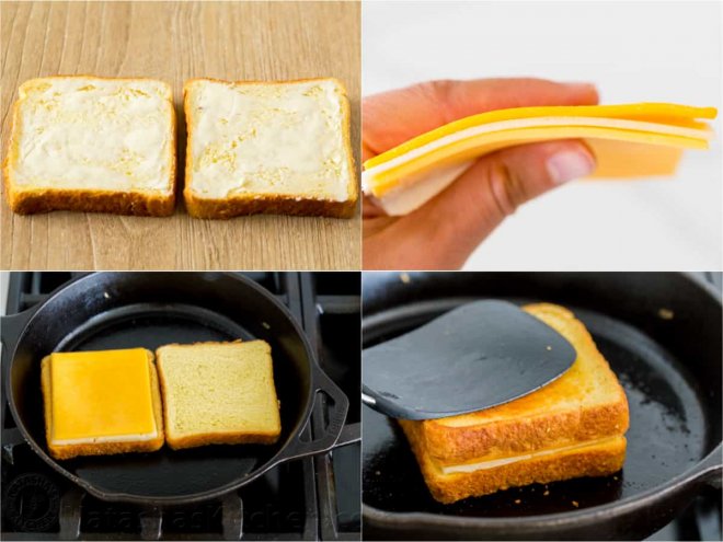 How to Make a Grilled CheeseButter the toast – spread 1/2 Tbsp butter on one side of each slice of bread. Heat skillet – place a skillet over low to medium/low heat. If you’re using a griddle, it should be at 275˚F. Immediately add 2 slices of bread with the buttered side down. Add cheese – stack the cheese on one of the pieces of bread, cover it with the other piece of toast and flip the sandwich over. Brown the toast – Continue sauteeing, flipping once, until both sides are golden brown and cheese is melted. Serve – cut the sandwich in half on the diagonal to serve.