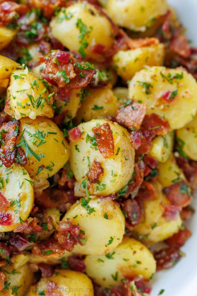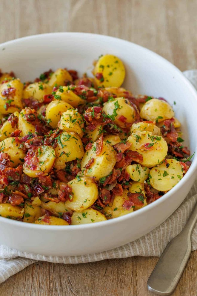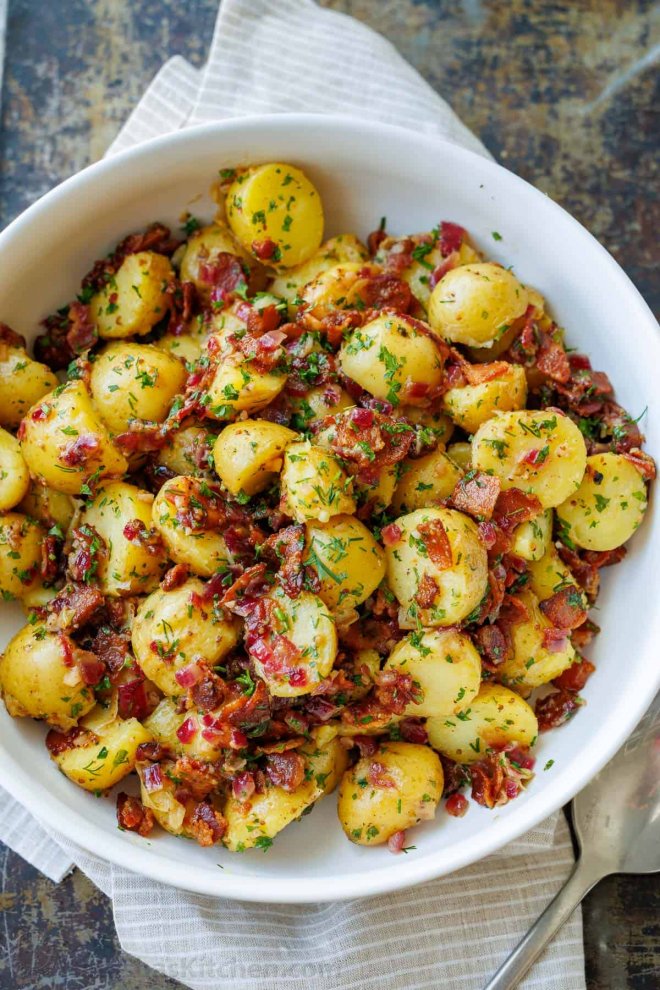 German Potato Salad is the perfect side dish. It blends traditional Potato Salad with savory flavors from the added garlic, bacon, and red onion, all tossed in a warm mustard vinaigrette dressing rather than mayonnaise.