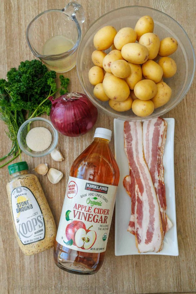 Potatoes – Provide the main texture and bulk of the salad. Use whole, unpeeled Yukon or red potatoes, which hold their shape after cooking to create a satisfying base.Olive Oil – Use for sautéing other ingredients like the bacon and onions.Bacon – Chopped into 1/2 inch pieces, contributes a smoky, savory flavor and a crispy texture.Aromatics – Red onion and garlic add depth of flavor and aroma to the dressing.Herbs – Fresh parsley and dill add vibrant flavors and color.Dressing IngredientsChicken Stock – (or vegetable stock or water) balances the tanginess of the vinegar and adds extra moisture.Apple Cider Vinegar – adds a tangy acidityMustard – We love Dijon or stone ground mustard (see more options below), which add a sharp, tangy flavor to the dressing.Sugar – (or honey) balances the acidity of the vinegar and adds a touch of sweetness.Salt and Pepper – Season to taste.