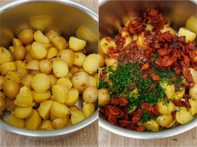 Combine and Garnish -While the potatoes are still warm, cut them into bite-size chunks. You can peel the potatoes, but I prefer to keep the skins on. Place the potatoes in a large mixing bowl and top with the dressing. Add the bacon and herbs, and toss to combine. Garnish with more parsley or dill if desired.