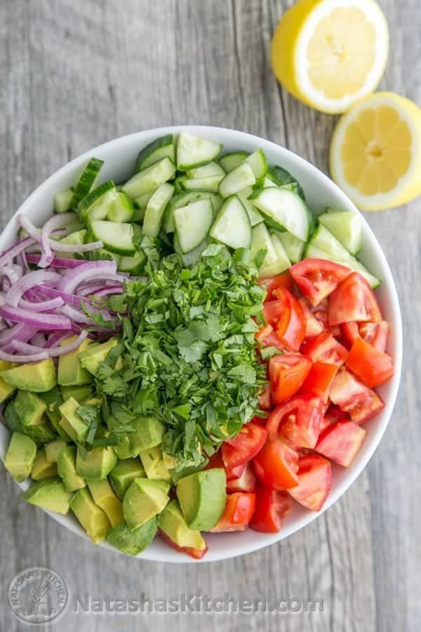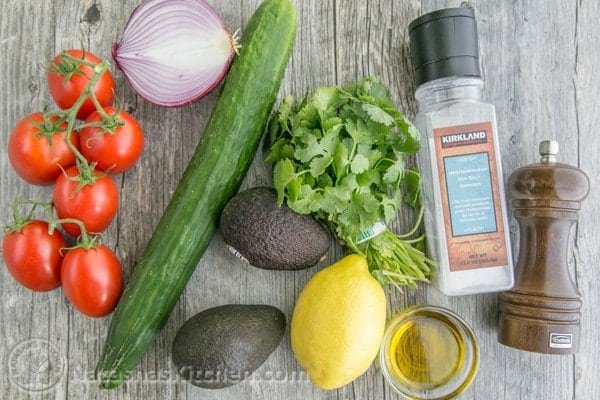 Ingredients for Tomato Avocado Salad:This salad is loaded with veggies; juicy tomatoes, crisp cucumber, creamy avocado and the cilantro and lemon juice make the whole salad so fresh and flavorful!