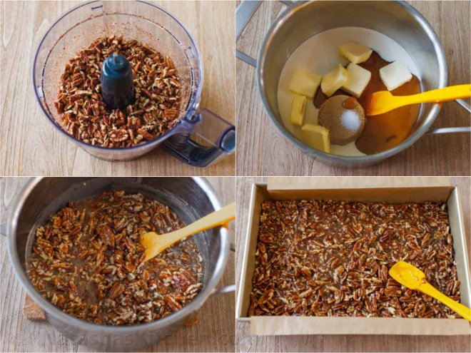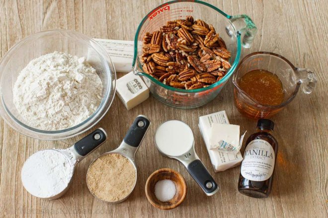 All-purpose flour – creates the perfect sturdy base for the crust. I recommend unbleached, organic flour if you can get your hands on it. Powdered sugar – lightly sweetens the crust (most of the sweetness comes from the caramel topping).Salt – fine sea salt balances the sweetnessButter – use unsalted, cold butter which creates a rich buttery crustFor the Pecan Filling: Light Brown Sugar – has molasses which adds rich color and flavor to the caramel Honey – creates a soft caramel baseUnsalted butter – adds richness to the caramel and buttery flavor Heavy whipping cream – make sure to use HEAVY cream which has a higher fat content to help the filling thicken up properlySalt – we use a bit of fine sea salt to balance the sweetness Vanilla extract – we recommend homemade vanilla extract for the best flavor. Pecans – coarsely chopped pecans add great crunch and texture to the filling
